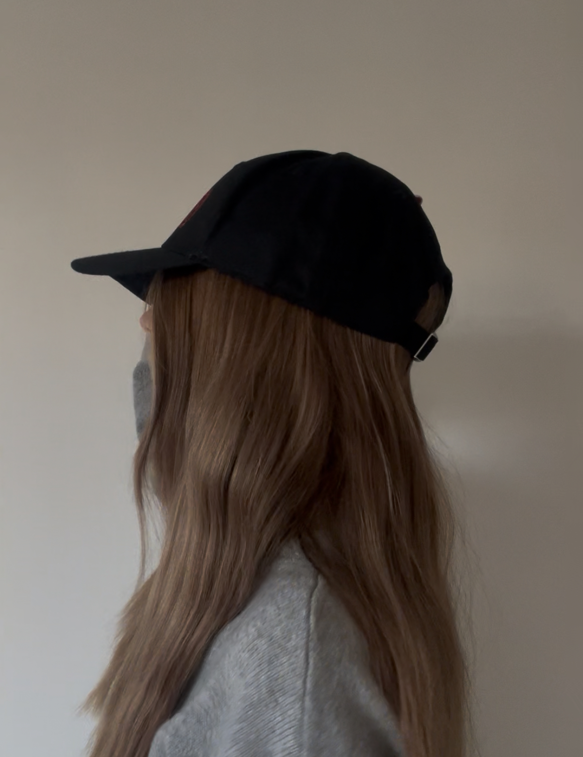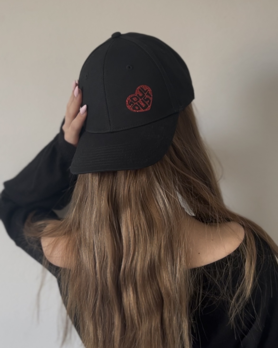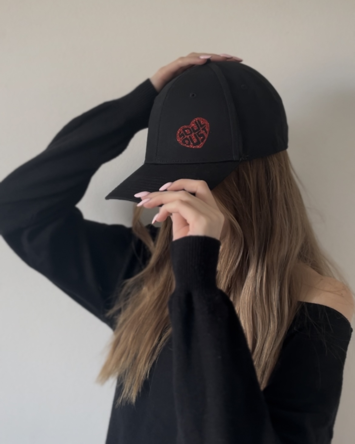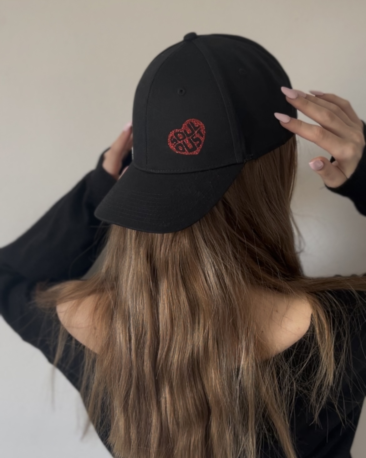 Črna klasična kapa z glitter rdečim SoulDust logotipom v obliki srca ustvarja subtilen svetleč efekt, ki pride do izraza pod svetlobo kluba ali sonca.